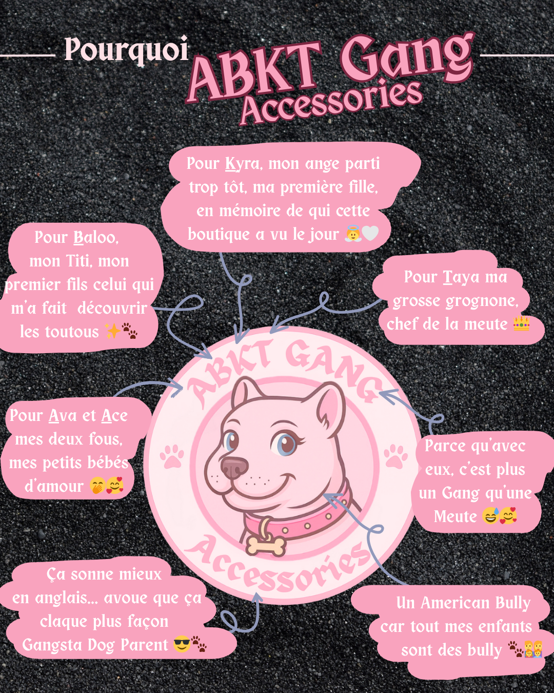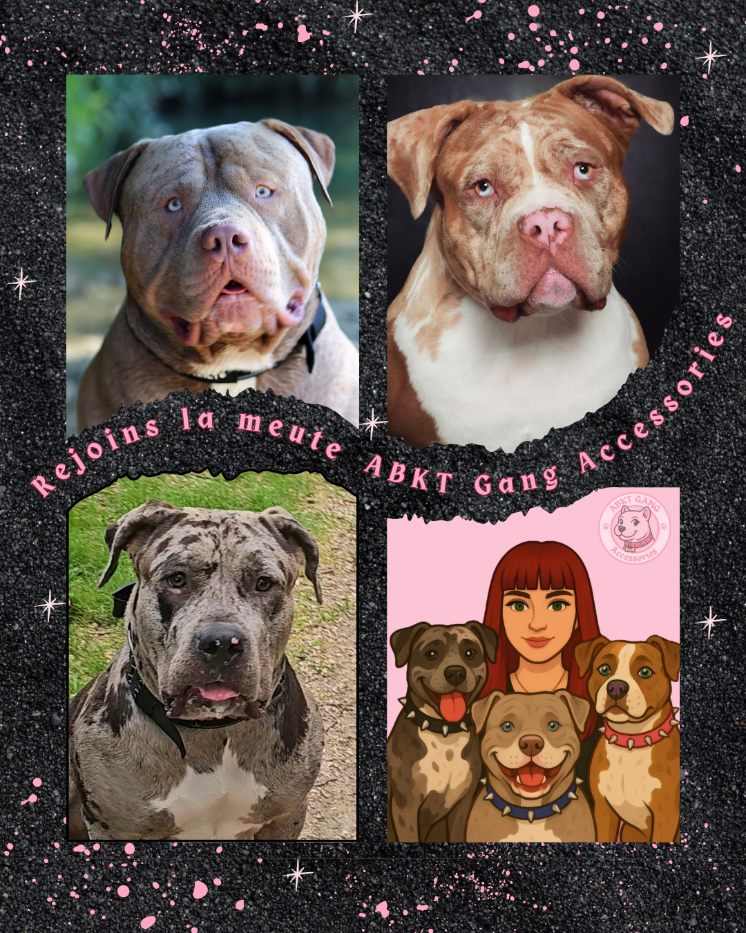 Chez ABKT Gang Accessories, on crée des accessoires en Biothane pour chiens de caractère. Pas de stéréotypes ici : que tu sois un molosse qui aime les paillettes ou un Chihuahua avec un collier à pics, t’as ta place dans la meute.