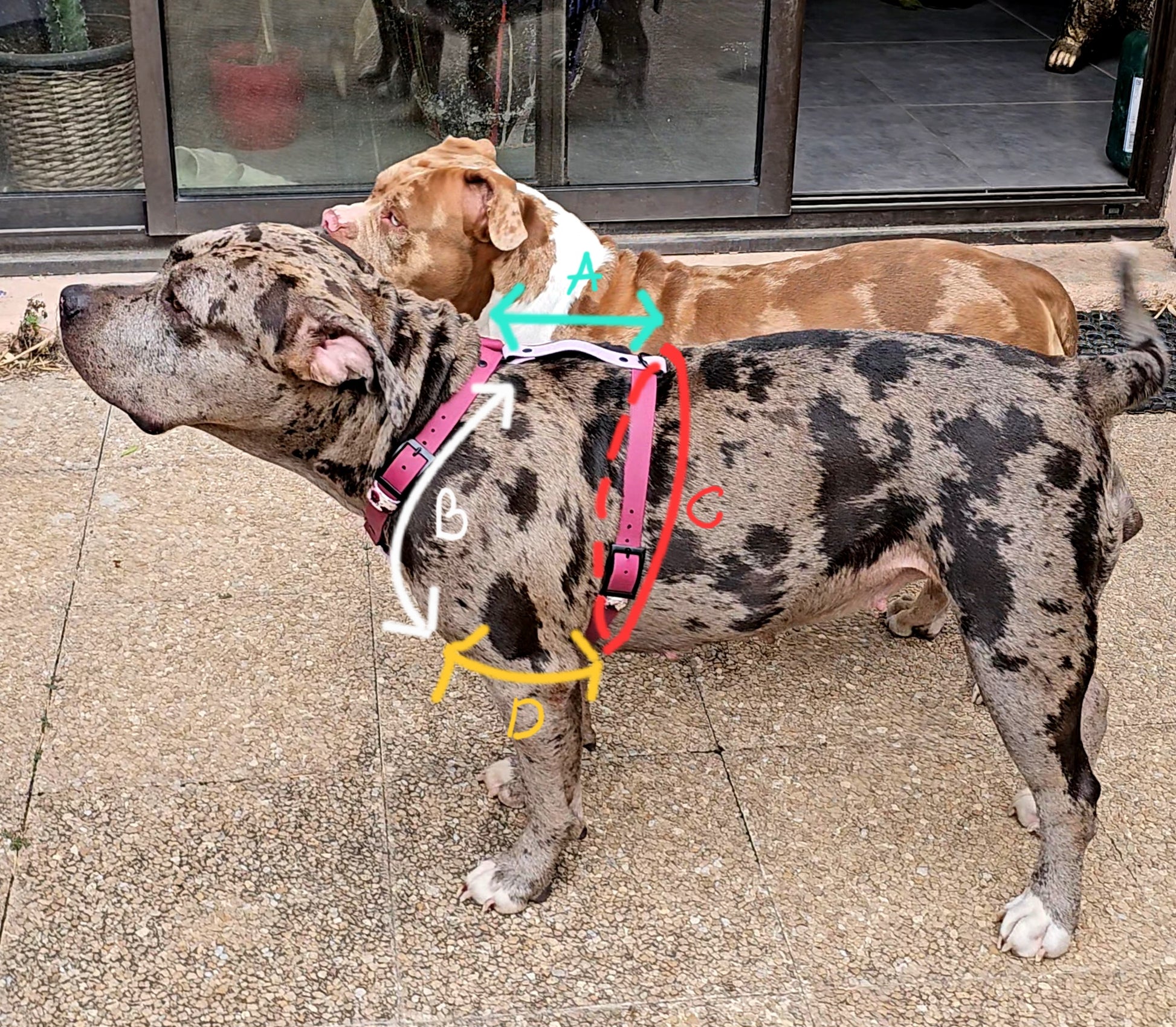 • C → Tour de thorax (derriĂšre les pattes, 5–7 cm derriĂšre les coudes 👉 Pour les petits gabarits, adaptez la mesure : il faut laisser un lĂ©ger espace afin que le harnais ne frotte pas sous les aisselles lorsque le chien est en mouvement.)